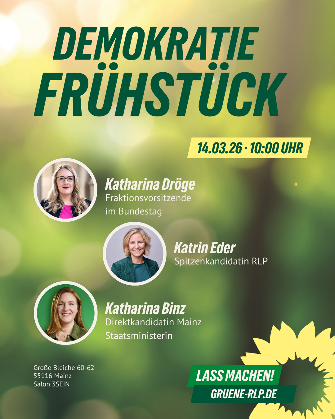 Beim Demokratiefrühstück mit Katharina Dröge (Bundestagsfraktionsvorsitzende), Katrin Eder (Spitzenkandidatin), Katharina Binz (Ministerin, Direktkandidatin Mainz I) und Misbah Khan, MdB wollen wir über den Schutz unserer Demokratie und die aktuelle Debatte um ein mögliches AfD-Verbotsverfahren ins Gespräch kommen.
